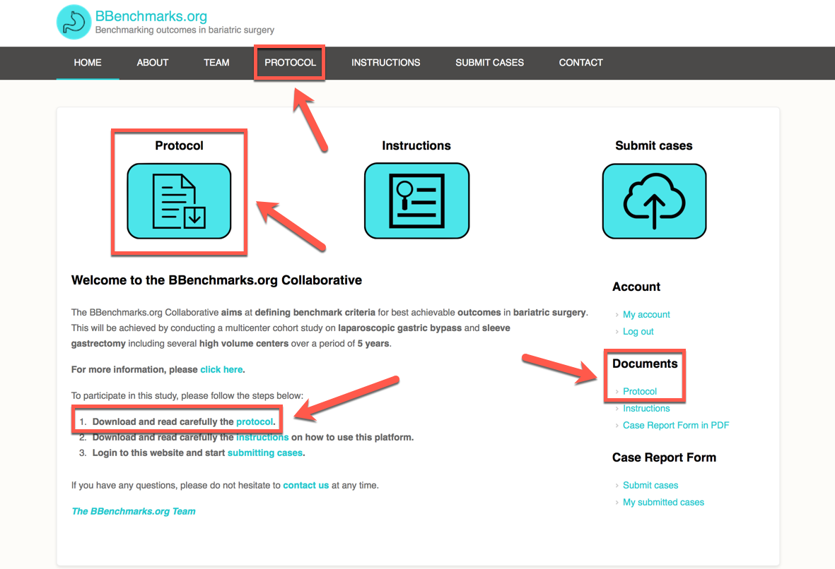 - Please ensure that you have carefully read the study protocol before attempting entering cases at our Data Entry Management System (DEMS). To do so, please click on the “Protocol” icon shown as shown below. The link to the protocol is also available on the main menu and right side bar of the website in all pages. Alternatively you may directly access the study protocol using the following link: https://bbenchmarks.org/?q=protocol