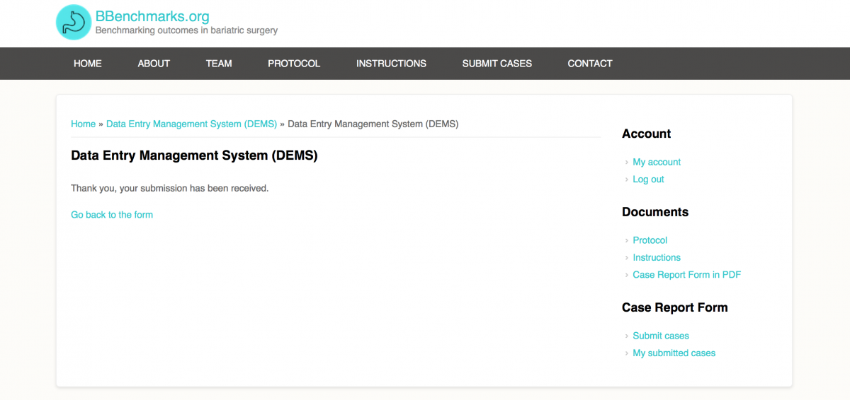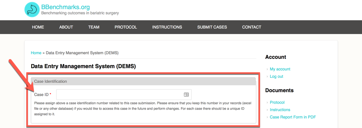 - The Data Entry Management System (DEMS) consists of a simple electronic form that you may fill in the data for each case (see image below). The DEMS can be also accessed directly using the following link: https://bbenchmarks.org/?q=submit_cases